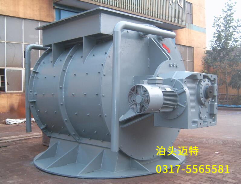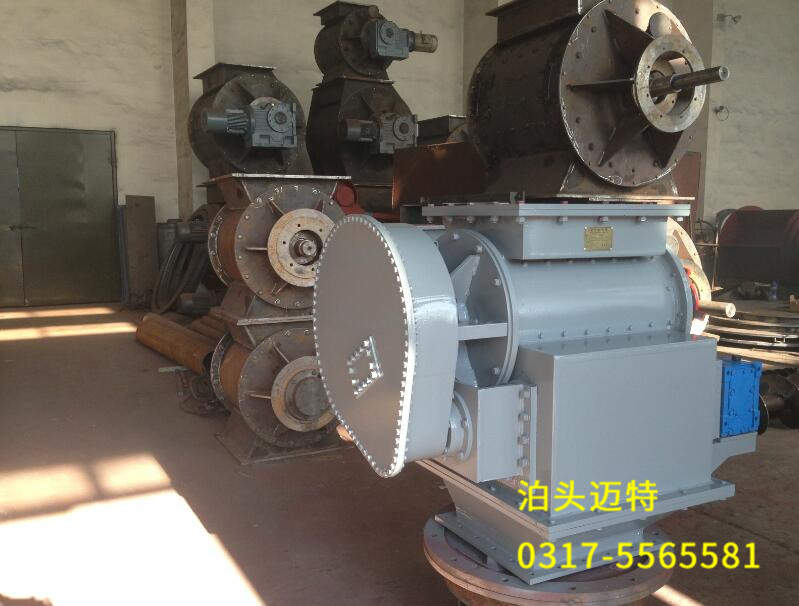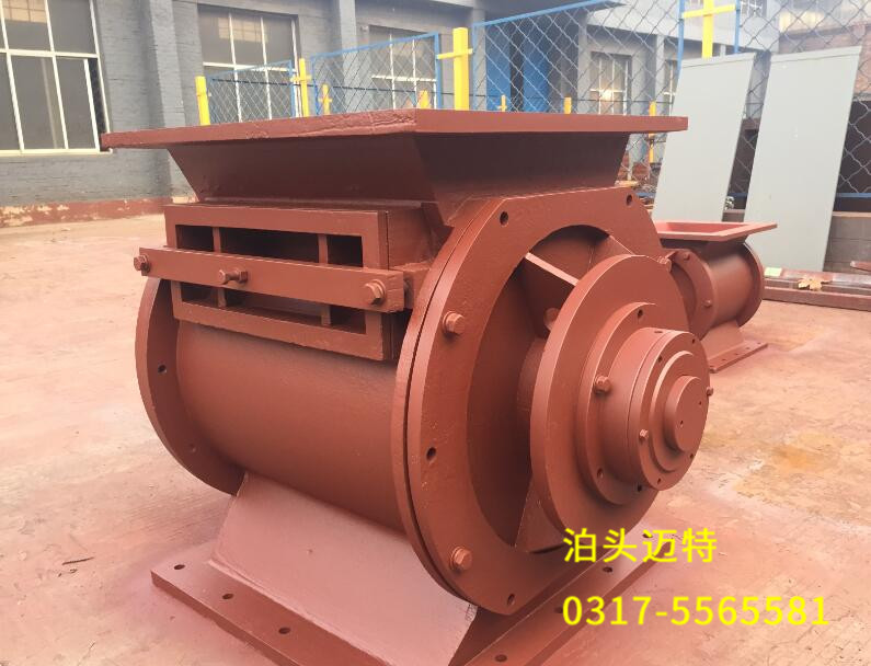 此卸料器都备有热风通道,当入料湿度大时,叶轮底可能粘有一定厚度的粉状物料,这时就应该通此温度较高的气体,使其底部的物料干燥,不易粘接在叶轮底部,不会影响给料量,不用时把进出风口盲死。