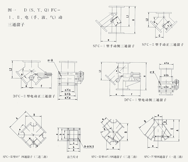 本阀主要由阀体、阀轴、阀板、曲柄机构、电动推杆(电液动推杆或手动机构)等组成。工作时电、液动推杆的直线往复运动,(手动由外力)通过曲柄带动阀轴、阀板作一定角度的摆动,从而达到控制物料流向,分送物料之目的。