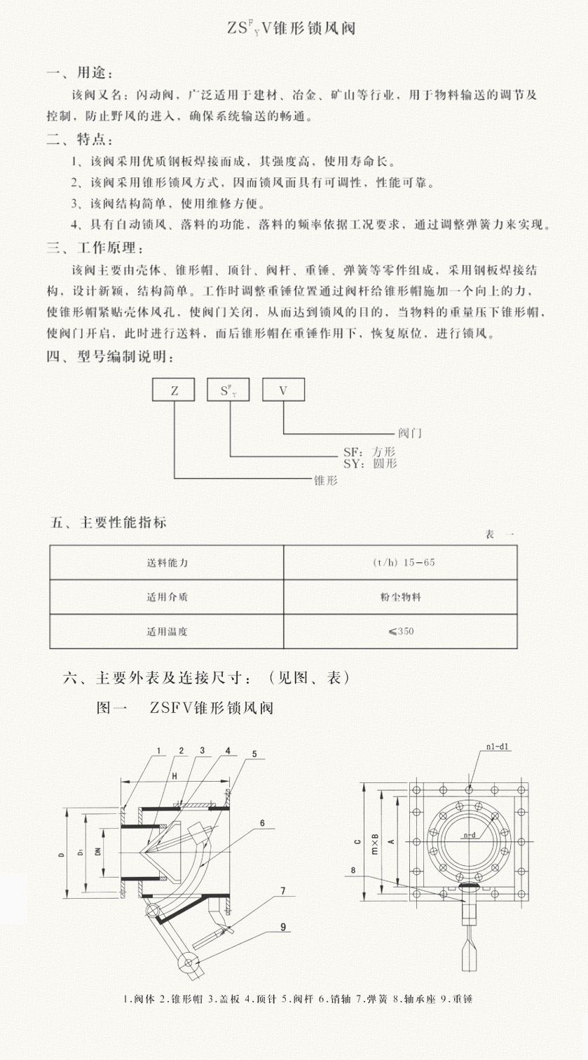 该阀主要由壳体、锥形帽、顶针、阀杆、重锤、弹簧等零件组成,采用钢板焊接结构,设计新颖,结构简单。工作时调整重锤位置通过阀杆给锥形帽施加一个向上的力,使锥形帽紧贴壳体风孔,使阀门关闭,从而达到锁风的目的,当物料的重量压下锥形帽,使阀门开启,此时进行送料,而后锥形帽在重锤作用下,恢复原位,进行锁风。