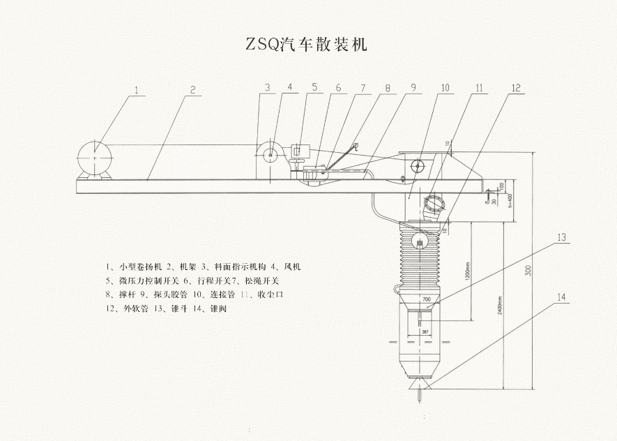 ZSQ汽车散装机主要由机架、装载头、料面指示机构、松强开关及小型卷扬机等组成,机架为焊接结构。;装载头主要由可伸缩的内外软管、管架及锥斗等组成。内软管用于下料,外软管用于收尘。料面指示机构由风机微压力控制器与作为控头的胶管等组成。松强开关由行程开关及固定在撑杆上的凸轮等组成。卷扬机是小型低速的滑轮倍率1:1,在其内部设置四个行程开关,通过调整挡块盘上挡块,可以方便灵活地高速卷扬机出强的长度,即控制装载头的升降距离。卷扬机采用了先进的盘式制动电机,具有体积小巧的特点。另外,本机设有两个收尘口。