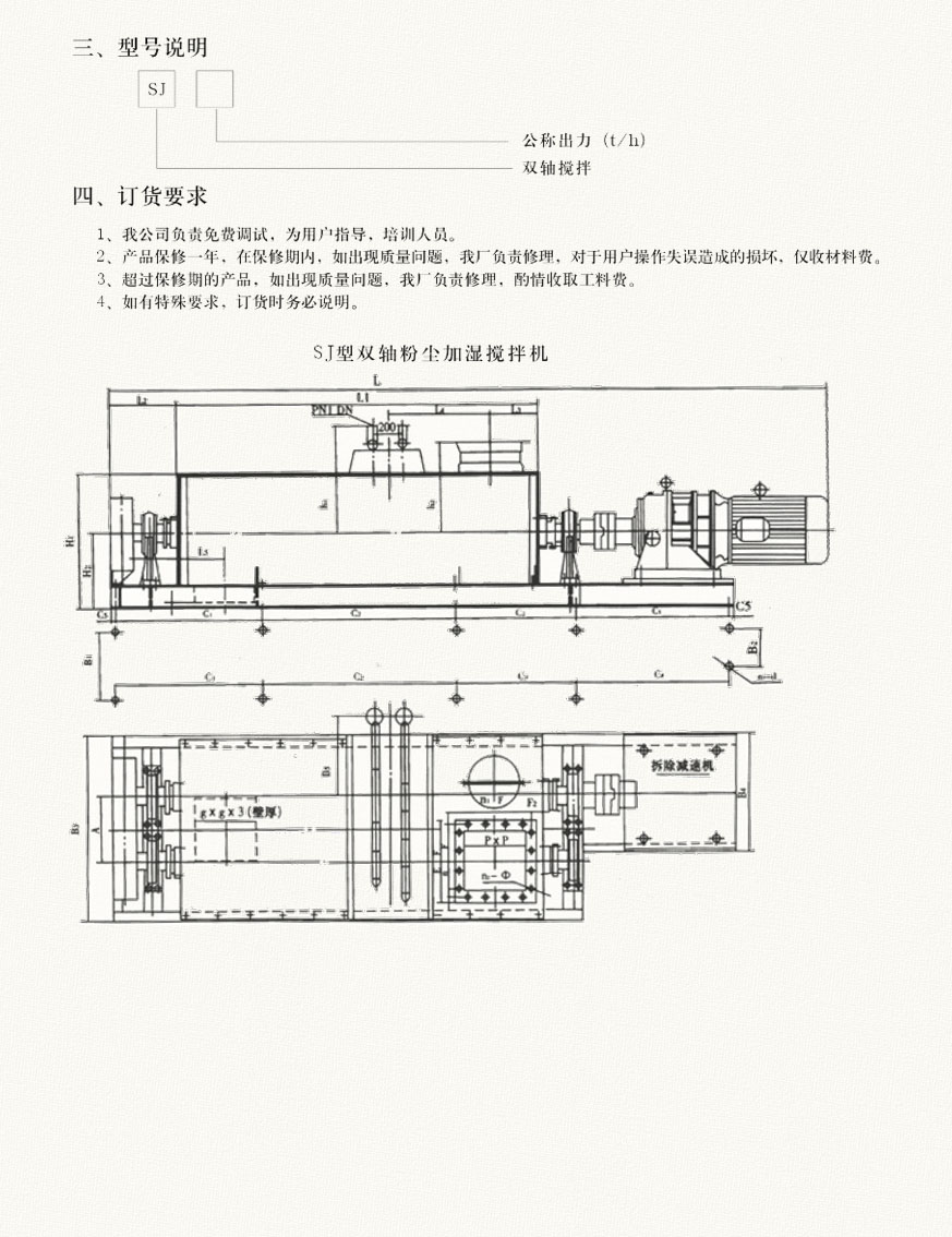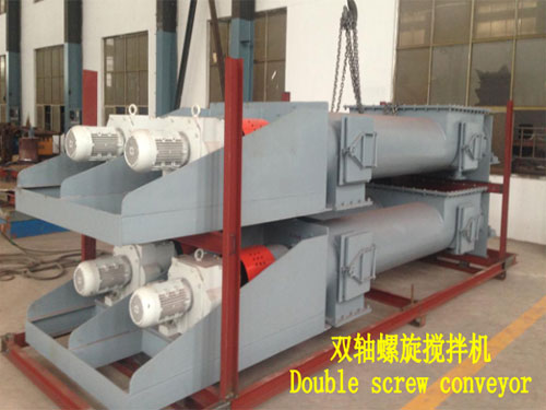 SJ型双轴搅拌机是将粉状物料进行喷水搅拌、混合的设备。主要使用在火力发电厂的除尘器下,也可供化工、冶金、矿山、建材等行业使用。通过控制加水量,以达到核实的湿度要求。采用两组螺旋叶片进行搅拌。搅拌效果高,占地面积少。螺旋叶片采用高耐磨特种合金或复合陶瓷,使用寿命长。双轴搅拌机采用摆线针轮减速器传动,转动平稳。噪音低。双轴搅拌机从顶部进料,底部排料,结构合理。各结合之间的密封严密,运行平稳。双轴搅拌机舍友加湿喷水系统,保证喷水均匀,调节供水量来满足需要。采用手压油泵集中供给四个传动轴承润滑油脂,方便设备的使用维护,具有省时的特点。